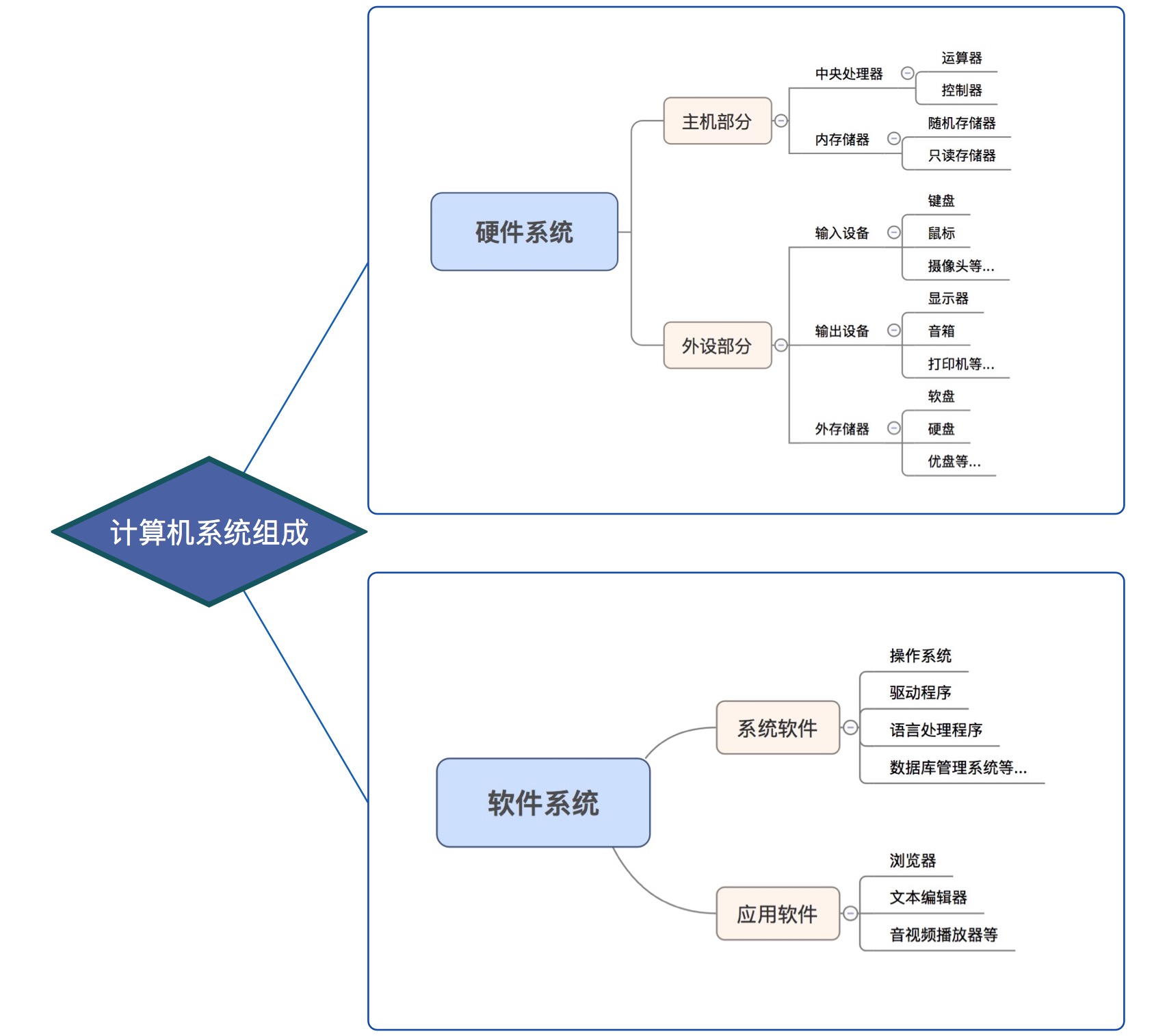 一个完整的计算机系统,是由硬件系统和软件系统两大部分组成的。