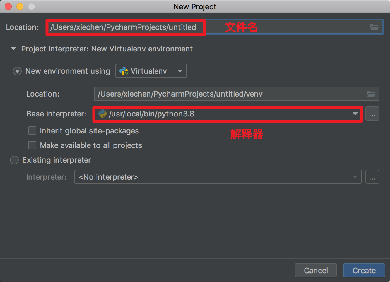 2. 选择 Location 表示该项目保存的路径,Interpreter 表示使用的Python解释器版本,最后点击Create 创建项目