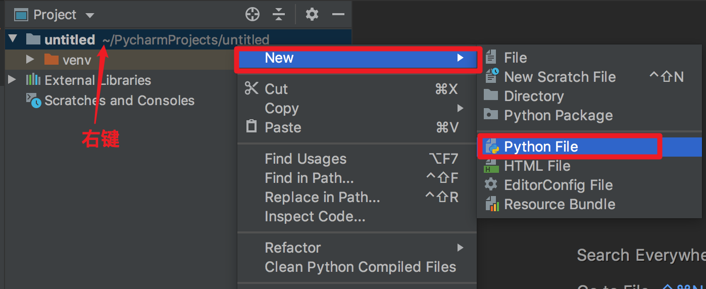 3. 右击项目,选择New,再选择Python File