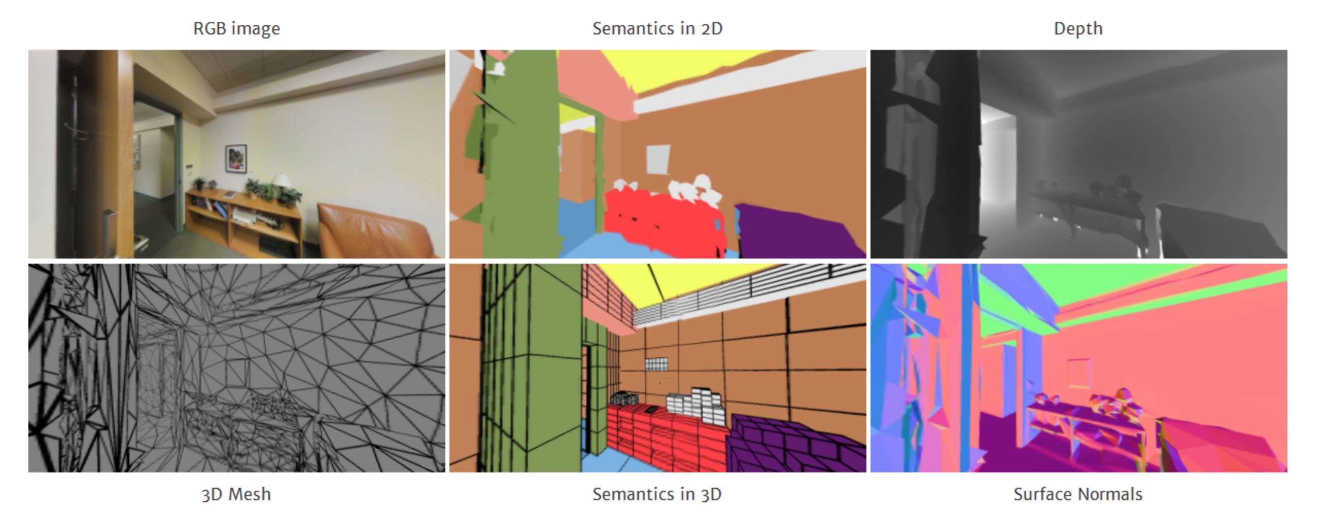 是一个多模态、大规模室内空间数据集,是斯坦福三维语义分析工作[64]的扩展。提供了多个模态:二维RGB,2.5维添加深度信息的图片、三维网格和点云,均提供分割标注信息。该数据集有70496张高分辨率的RGB图像(1080x1080分辨率),以及其对应的深度图谱、表面法线、网格以及点云,军事带有像素级别及点级别的语义标注信息。这些数据取自6个室内区域,分别来自三个不同的教育与办公建筑。共有271个房间,大约7亿个点,被标以13个类。