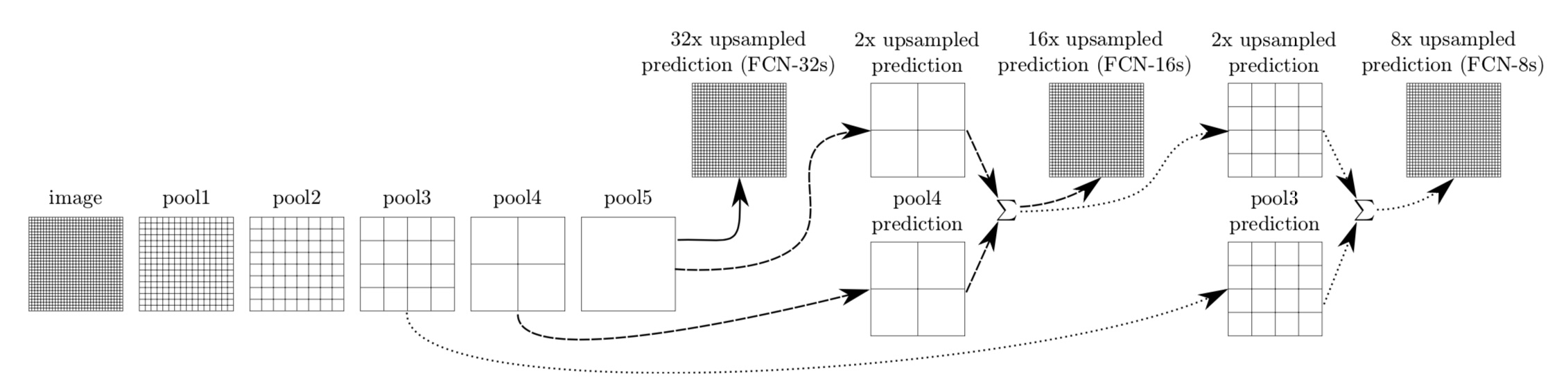 作者在试验中发现,得到的分割结果比较粗糙,所以考虑加入更多前层的细节信息,也就是把倒数第几层的输出和最后的输出做一个fusion,实际上也就是加和,过程如下,一共有三种方式: