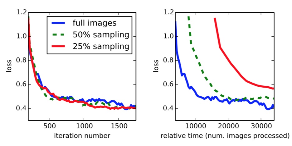 图中对比了patch取样,全图有效地训练每张图片batches到常规的、大的、重叠的patches网格。采样在收敛速率上没有很显著的效果相对于全图式训练,但是由于每个每个批次都需要大量的图像,很明显的需要花费更多的时间。