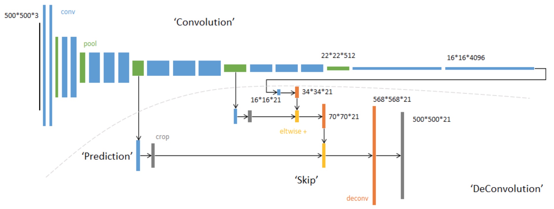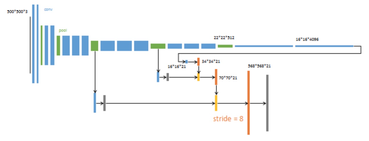 上采样分为两次完成(橙色×2)。 在第二次上采样前,把第4个pooling层(绿色)的预测结果(蓝色)融合进来。使用跳级结构提升精确性。 第二次反卷积步长为16,这个网络称为FCN-16s。 这一阶段作者使用单GPU训练约需1天。