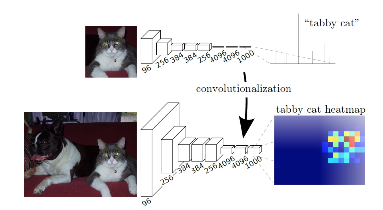 一般图像分类CNN网络在最后一层卷积层后会跟若干个全连接层, 将卷积层产生的特征图映射成一个固定长度的特征向量。论文中的例子:输入一张猫的图片, 经过CNN网络, 得到一个长为1000的输出向量, 这个向量经过softmax归一化,分别对应1000个类别的概率,这样我们可以得到输入图像属于每一类的概率, 在下例中我们可以看出图像属于"tabby cat"这一类可能性最大。