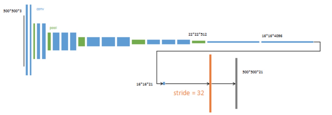 从特征小图(16x16x4096)预测分割小图(161621),之后直接升采样为大图。 反卷积(橙色)的步长为32,这个网络称为FCN-32s。 这一阶段作者使用单GPU训练约需3天。