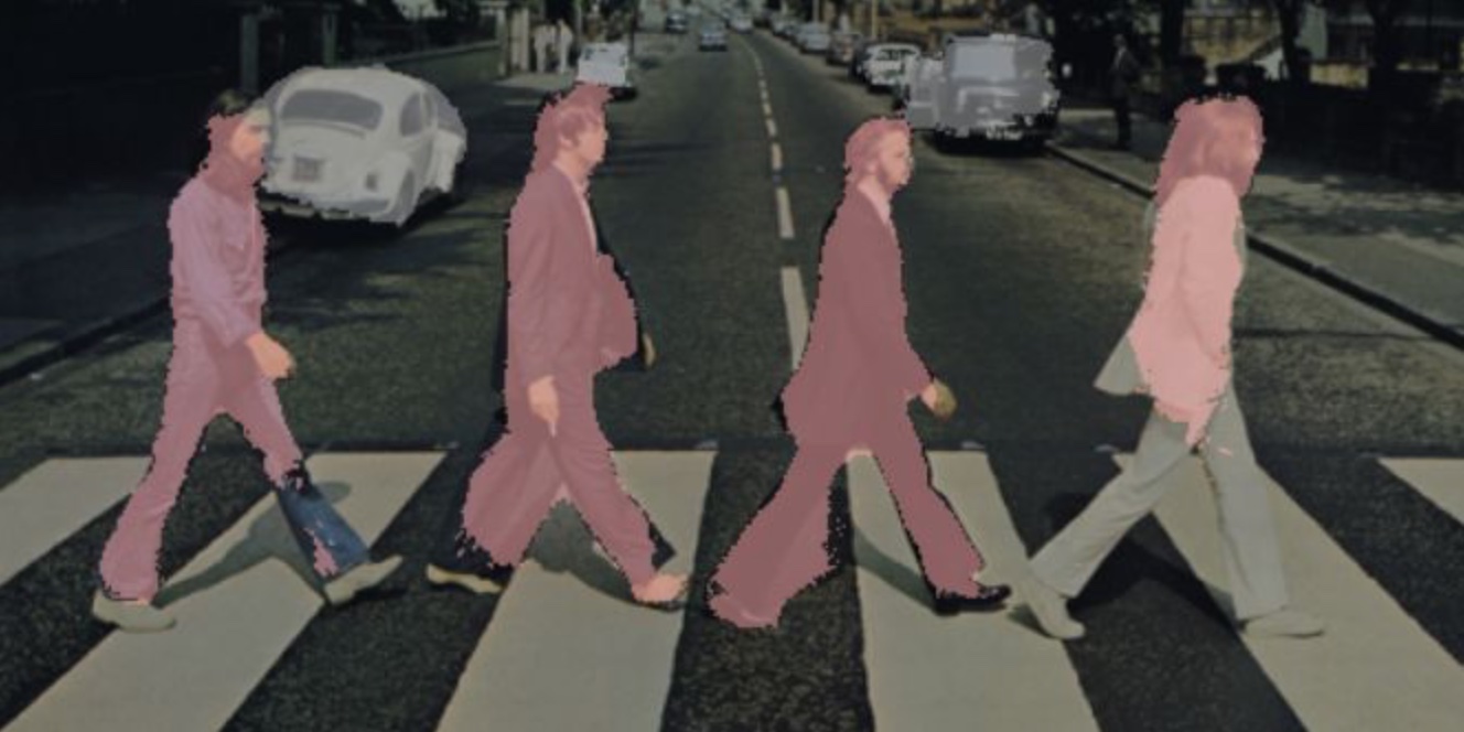 你可以从上图中看到,实例分割算法为四位披头士成员和一些汽车创建掩码(不过该结果并不完整,尤其是列侬)。