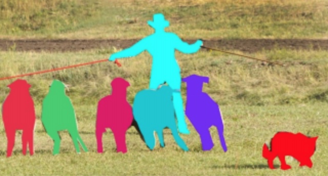 - 语义分割就是把图像中每个像素赋予一个类别标签,如下图我们将图像中的像素分类为人,羊,狗,草地即可。