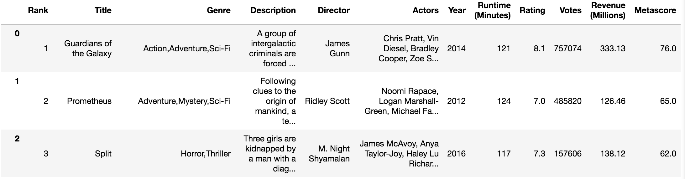 Rank Title Genre Description Director Actors Year Runtime (Minutes) Rating Votes Revenue (Millions) Metascore