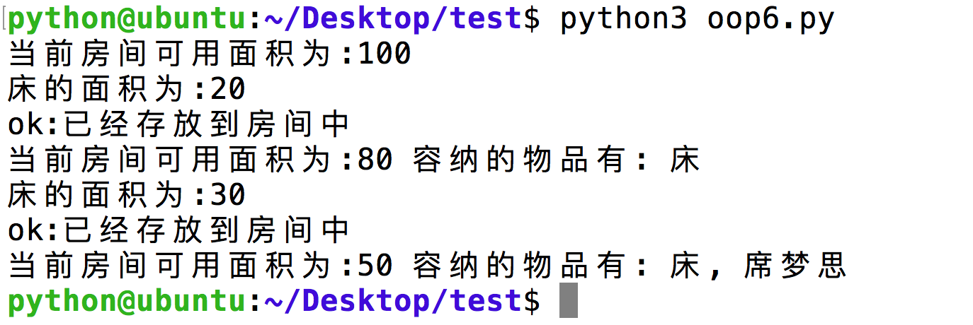 print("err:房间可用面积为:%d,但是当前要存放的物品需要的面积为%d"%(self.area, needArea))