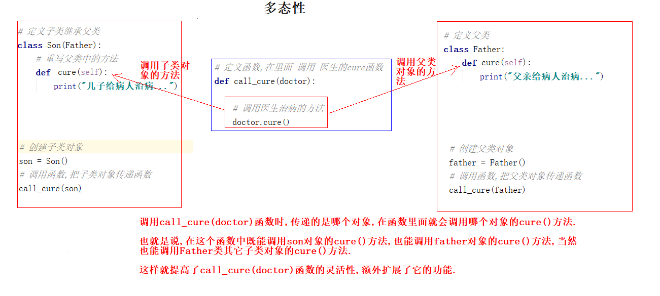 给call_cure(doctor)函数传递哪个对象,在它里面就会调用哪个对象的cure()方法,也就是说在它里面既可以调用son对象的cure()方法,也能调用father对象的cure()方法,当然了也可以在它里面调用Father类其它子类对象的cure()方法,这样可以让call_cure(doctor)函数变得更加灵活,额外增加了它的功能,提高了它的扩展性.