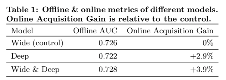 效果显示:3周的线上A/B实验,实践表明wide&deep框架显著提高了移动app score 的app下载率