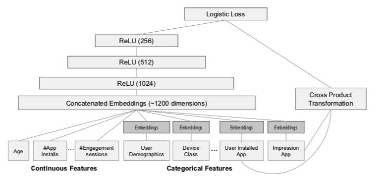 Wide部分只用了一组特征叉乘,即被推荐的app ☓ 用户下载的app。作者为什么这么做呢?结合业务思考,在Google Play商店的app下载中,不断有新的app推出,并且有很多“非常冷门、小众”的app,而现在的智能手机user几乎全部会安装一系列必要的app。这时Wide可以发挥了它“记忆”的优势,作者在这里选择了“记忆”user下载的app与被推荐的app之间的相关性,有点类似“装个这个app后还可能会装什么”