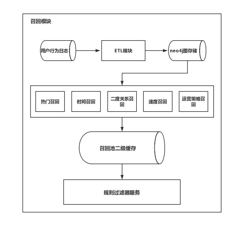 - 召回模块组成: 召回模块包括, ETL模块, 召回池(包含各种召回策略), 召回池二级缓存, 规则过滤器服务。