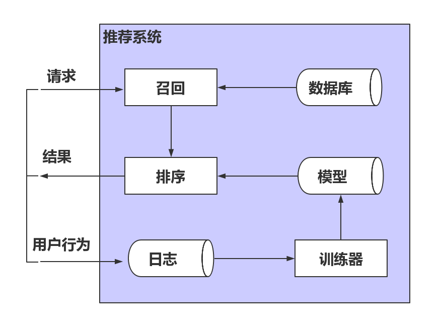 - 推荐系统嵌入在后端框架当中,作为一个模块调用